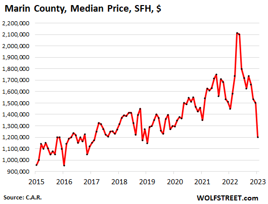 San Francisco: The median price of single-family houses plunged 33%, or by $675,000, from the breath-takingly idiotic peak in March 2022, falling from $2.06 million to $1.38 million in 10 months. Year-over-year, the median price plunged 15%.
