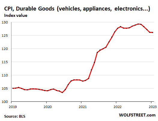 Price increases have moved to services, and away from goods. Retailers sell goods, not services. Many goods that they sell have had big price drops, including electronics big time (Walmart complained about that). So you have to sell more goods to just keep the dollar sales even. And if you book an 8% sales increase in goods, despite a bunch of prices having dropped, that’s a sign of strong demand.