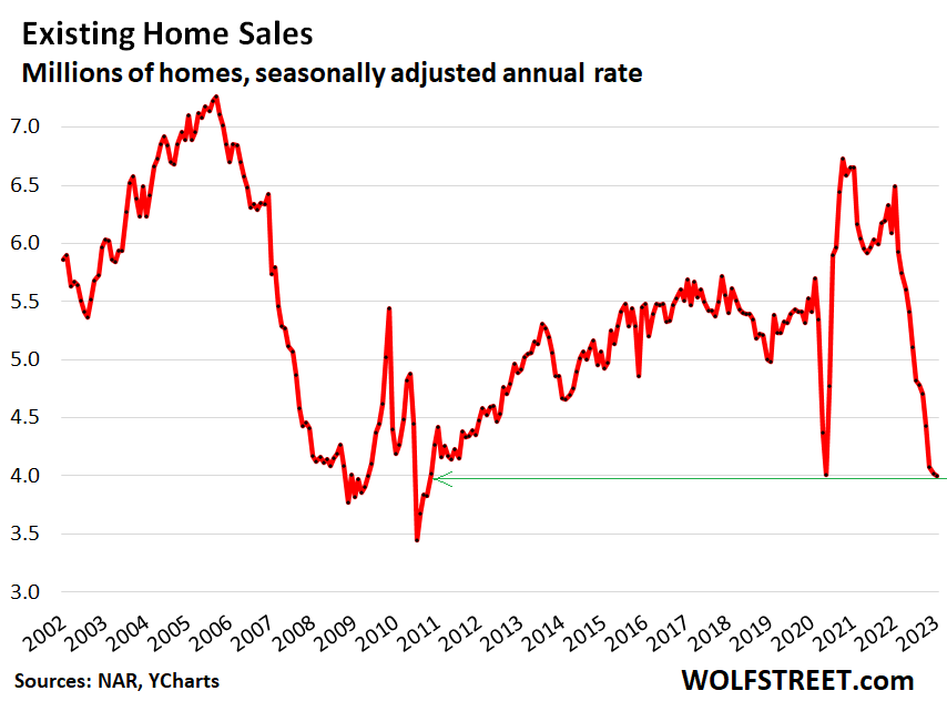 Across the US, home sales have plunged month after month ever since mortgage rates started to rise a year ago. In January, across the US, total home sales plunged by 37% from January last year. Sales plunged in all regions, but they plunged worst in the West, by 42% year-over-year, and the least worst, if I may, in the Midwest, by 33%. This is happening everywhere.