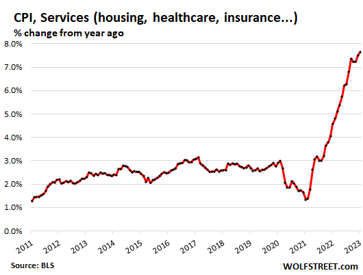 But by then, inflation had shifted to services. And as goods price increases began to moderate, or even backtrack, such as with electronics and used vehicles, the services inflation rate exploded, fueling further inflation fears: