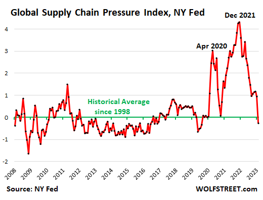 The unnerving supply-chain chaos during the pandemic has now been completely unwound. The chaos was caused when massively overstimulated consumers, particularly in the US, but elsewhere too, blew their pandemic trillions on goods, creating such demand for goods, and so suddenly, that no one was ready for it, and the global production and transportation system essentially locked up – causing large-scale shortages across numerous unlikely and unrelated products – including amazingly, the now infamous WOLF STREET beer mug shortage.