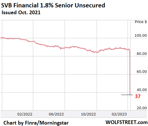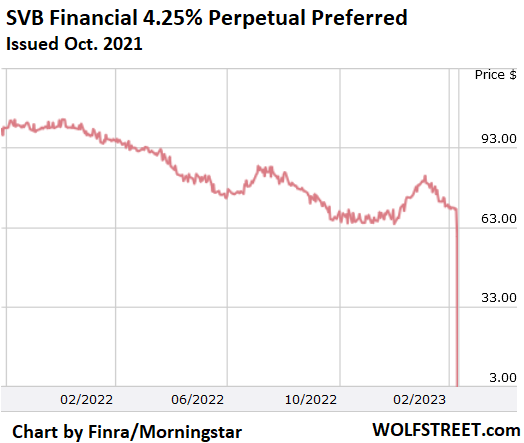 For example, based on bond data from Finra-Morningstar, the $1 billion of 4.25% perpetual preferred stock, which will get bailed in along with shareholders, collapsed in two days from 70 cents on the dollar to 3 cents on the dollar at the close on Friday.