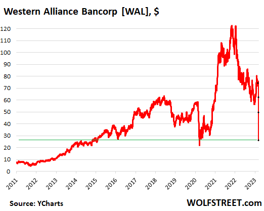 Western Alliance too was hit by a magnificent run on the bank. On March 10, when Silicon Valley Bank collapsed, Western Alliance released “updated financial figures” to show that deposits “remain strong,” liquidity “remains robust,” and capital remains “strong,” with various numbers attached, upon which its shares plunged.