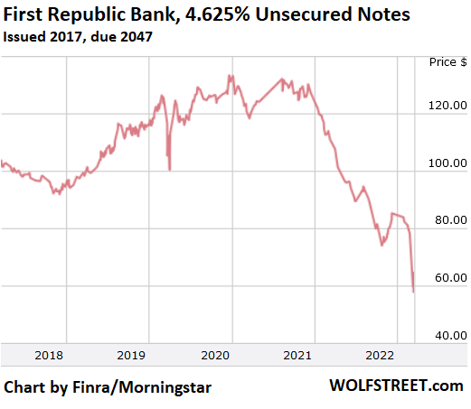 Upon the news, the subordinated notes First Republic issued in 2017, with a coupon of 4.625% plunged to a new low, after the bounce over the past two days, to 58 cents on the dollar, down by 56% from 132 in August 2021. These bonds are in line to get bailed in, along with shareholders if the same fate befalls First Republic that had hit Silicon Valley Bank (chart by Finra/Morningstar).