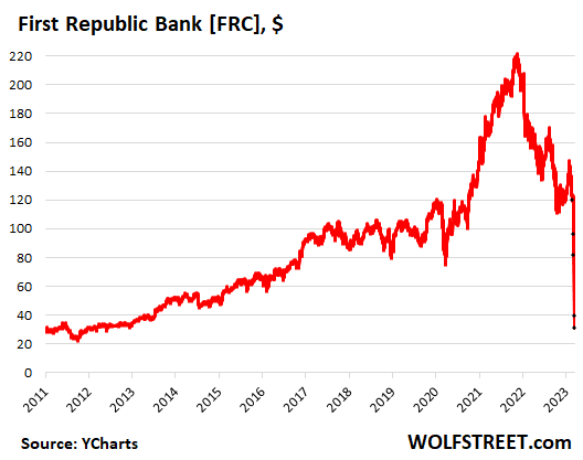 Yesterday evening, S&P Global had put First Republic on review for a downgrade, a day after Moody’s put the bank on review for downgrade. And now S&P Global reviewed the bank, and downgraded it four notches. Moody’s is still reviewing the bank, with a downgrade coming soon. So that’s a start. But it’s way late for investors in its bonds that had relied on these ratings and have already taken massive losses.