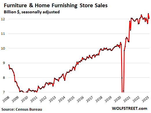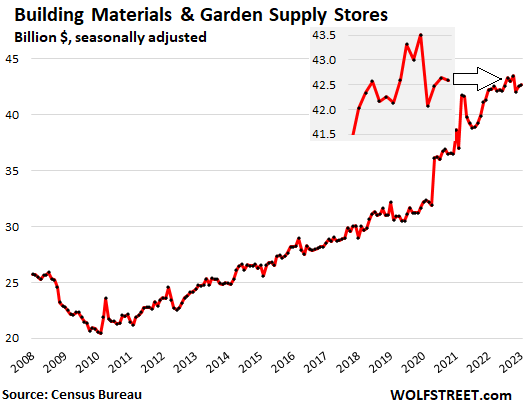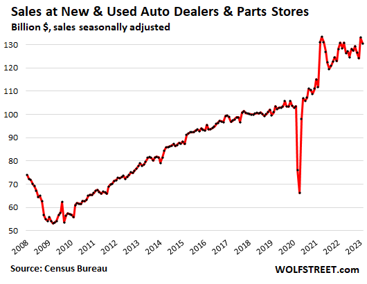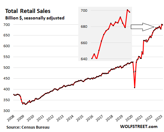Retail sales in February dipped 0.4% from the huge spike in January, to $698 billion, seasonally adjusted, the second highest ever, just a hair below January, when sales had spiked by 3.2%, preceded by declines in December and November, and by a jump in October. You see, this data is volatile.