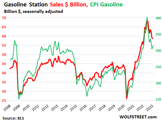 This chart shows the relationship between the CPI for gasoline as index value representing price levels not percentage changes (green) and sales in billions of dollars at gas stations, including all the other merchandise gas stations sell (red, left axis):