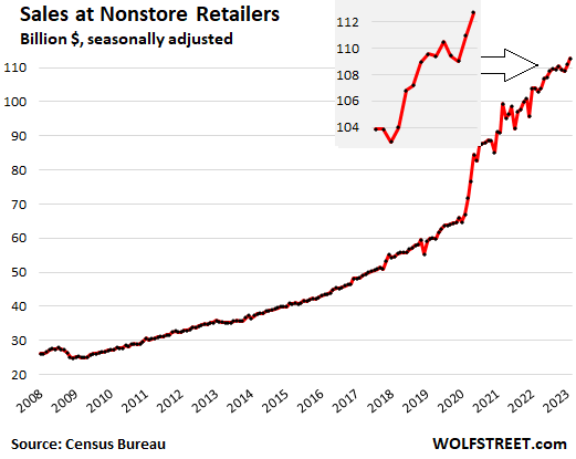 Nearly everything in retail except motor vehicles (and even there) is paid for with credit cards, online, everywhere. And almost all of it gets paid off before due date. About $5 trillion a year flow through credit cards as a payments method, and people collect 1% or 2% in cash back. The actual balances outstanding that accrue interest are not reported, and we don’t know what they are, but are estimated to be around $500 billion. And increase of $20 billion in that interest-accruing balance to $520 billion would mean $20 billion in additional borrowing to fund purchases. But following the holiday spree, credit card balances decline in the spring.