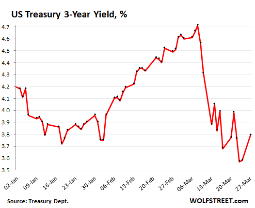 Then on Monday, including last Monday and today, as fear settled down and interest in Treasuries waned, prices fell and yields spiked, but they remain a lot lower than they were.