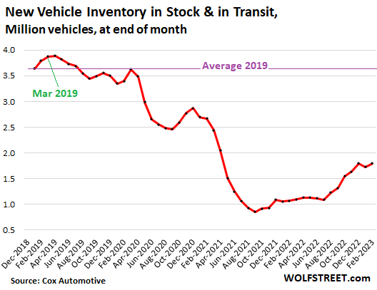 Inventories of new vehicles on dealer lots and in transit have more than doubled since the low point in the fall of 2021, to 1.80 million vehicles at the end of February, according to data from Cox Automotive. But this was still less than half the inventory in 2019: