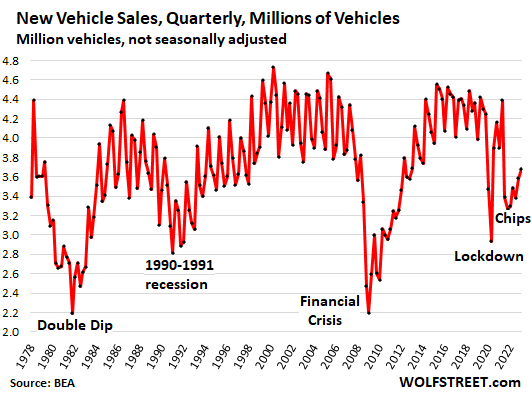 We can estimate this pent-up demand: Over the seven quarters since the chip shortages hit vehicle sales (starting in Q2 2021), automakers sold 24.1 million vehicles. Over the equivalent seven-quarter period just before the pandemic, automakers sold 30.1 million vehicles. So by now, consumers and fleets (rental fleets!) have bought 6 million fewer vehicles than over the equivalent period before the pandemic.