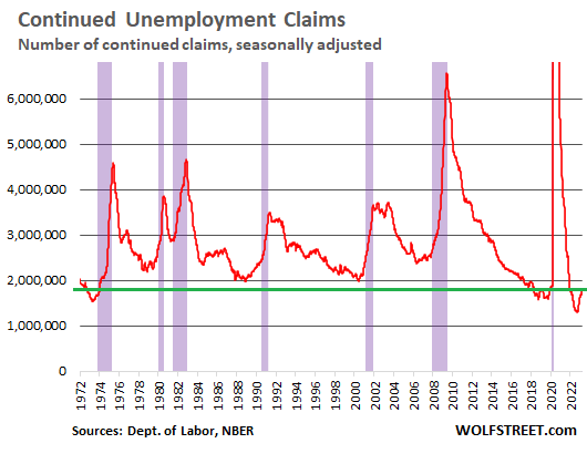The number of people who are still claiming unemployment insurance at least one week after the initial application – people who haven’t found another job yet – rose to 1.83 million, the highest since December 2021, according to the Labor Department today.