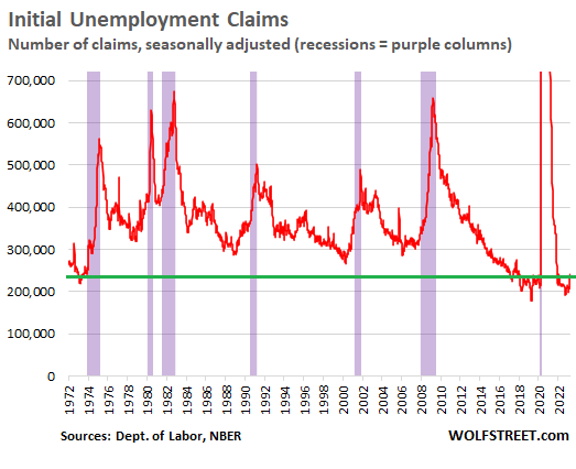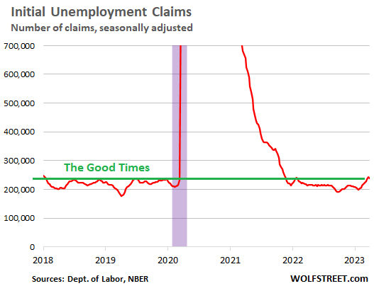 But the previous week was revised up today from the previously reported 198,000 claims. The chart of the 4-week moving average shows that initial claims for unemployment insurance, after the revisions, are at the edge of the high end of the Good Times before the pandemic, rather than inside the high end, where they had been before the revisions: