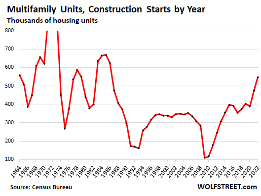 Boom of multifamily construction pressures older apartments. In 2022, construction started on 547,400 units in multifamily buildings of two units and larger, the highest since 1986, when the last multifamily boom ended. And it was up by 55% from the peak this millennium in 2005. And it followed the 473,800 units that were started in 2021, the most since 1987.