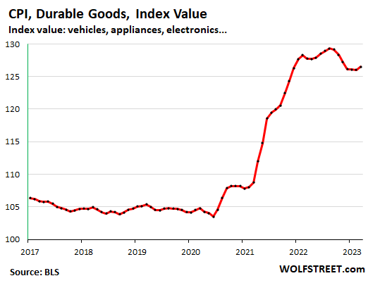 The CPI for durable goods, expressed as index value (not as percent change) shows the spike in late 2020 through mid-2022. Prices started to drop last fall, driven by sharp declines in used vehicles and consumer electronics. But in March, prices rose again: