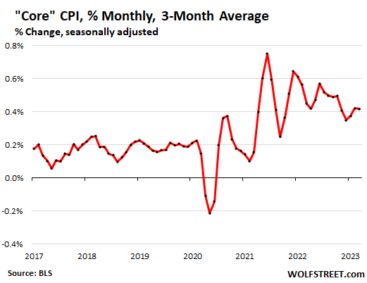 To see the trends amid these big monthly ups and downs, here is the three-month moving average of core CPI.