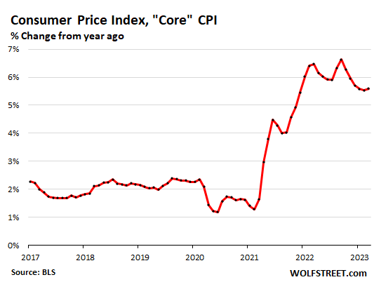 Core CPI – without the volatile food and energy products that consumer buy – jumped by 5.6% year-over-year, hotter than the 5.5% increase in the prior month, and the first year-over-year increase since September:
