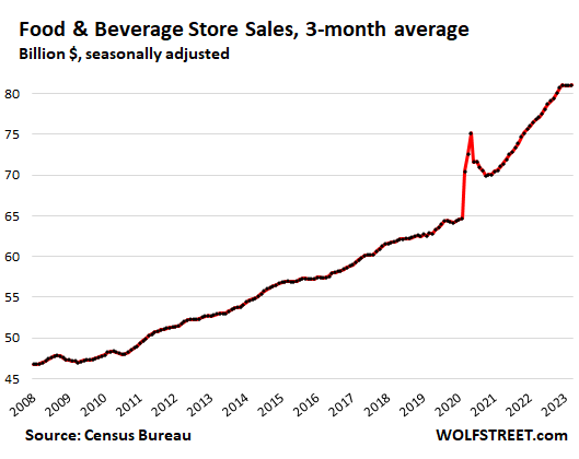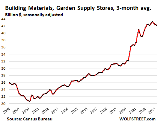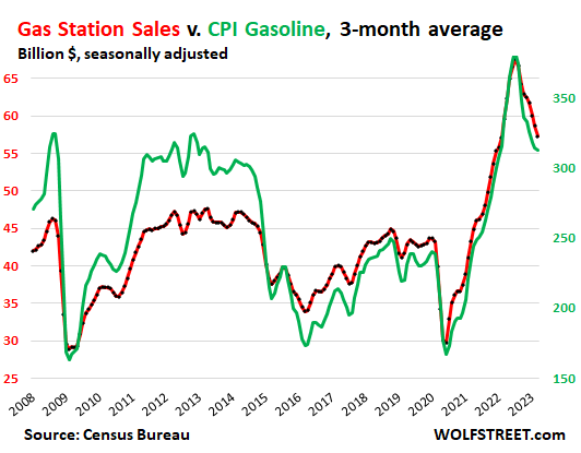 Dropping prices impact retail sales. Also note that the CPI for many categories of products that these retailers sell has dropped, with gasoline prices plunging, food prices dipping, and many goods prices falling, as inflation has shifted to services, and retailers don’t sell services; they sell goods. Dropping prices mean dropping sales, even when the retailer sells the same amount of goods. Further below you will see a chart of sales by gas stations overlaid with a chart of the CPI for gasoline, and they obviously run in near-lockstep because consumers buy about the same amount of gasoline in gallons, but when the prices change so dramatically, revenues (in dollars) change with the prices.