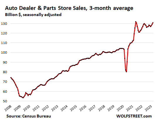 OK, I’ve had it with the artificial and useless drama of the month-to-month ups and downs of seasonally adjusted retail sales that are subject to big up-or-down revisions the following month. Retailers report their sales quarterly, and GDP is reported quarterly in the US, and so I’m going to switch my charts on retail sales to a three-month-moving average, which eliminates a lot of the noise that obscures the trends. And the past six months have been particularly noisy with huge ups and big downs.
