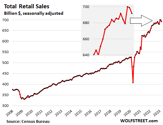 Inflation is now in SERVICES, where it rages, and services is 63% of total consumer spending, but RETAIL SALES ARE GOODS, NOT SERVICES.