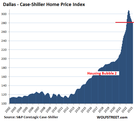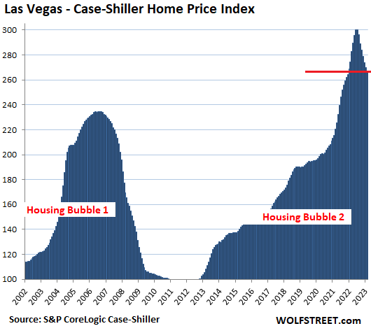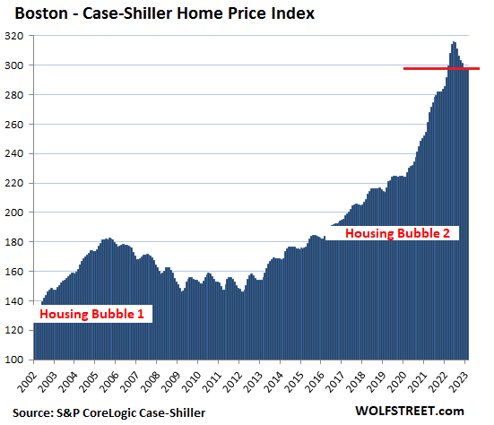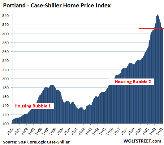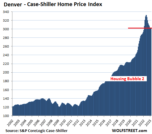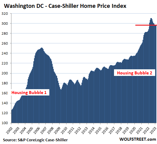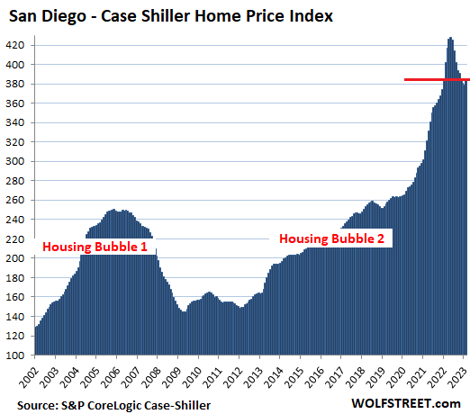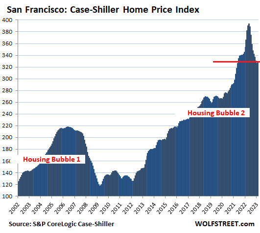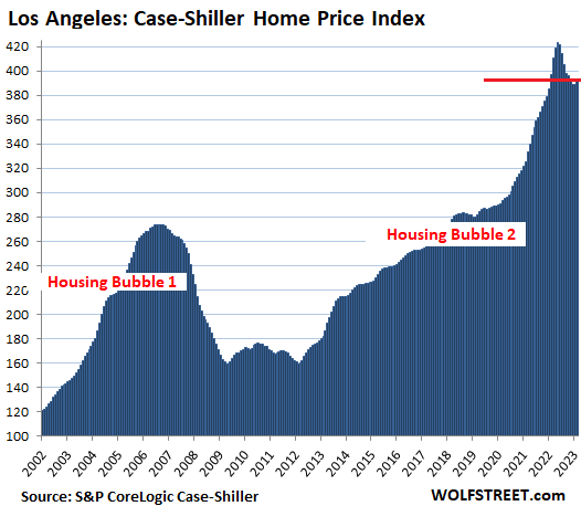 The effects of the banking crisis are not yet reflected in the housing market data. These home prices today are based on sales that closed in February and prior months, so the March fireworks at Silicon Valley Bank and at First Republic will make it into the housing data in future months.