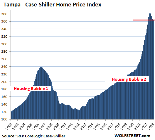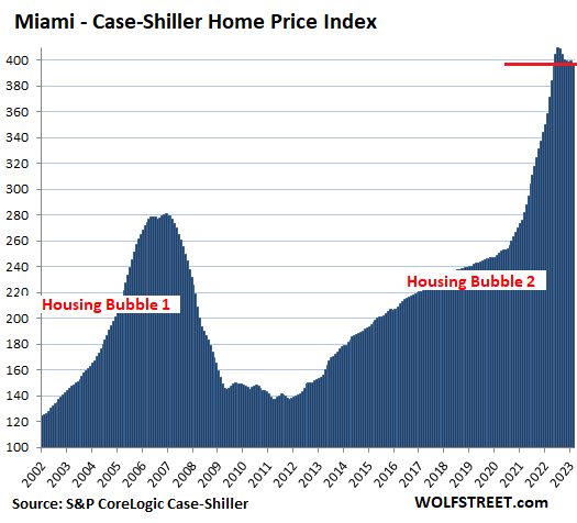 The Case-Shiller indices were set at 100 for the year 2000. So that Miami index at 397 points in February is up by 297% since 2000. This makes Miami the #1 most Splendid Housing Bubble in terms of price increases since 2000. Miami has moved into the #1 slot because its prices started to fall later than in the prior #1, Los Angeles and then San Diego.
