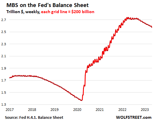 MBS -$17 billion for the week, -$164 billion from peak, to $2.58 trillion. The Fed only holds government-backed “Agency MBS” where the taxpayer carries the credit risk, not the Fed.