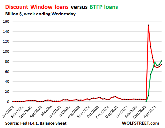 This chart shows both, the loans at the Discount Window (red) and the loans at the BTFP (green):