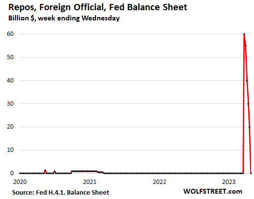 Repos with “foreign official” counterparties: -$20 billion in the week, to $0. They’re now paid off. This was likely the program that the Swiss National Bank used to provide dollar-liquidity support for the take-under of Credit Suisse by UBS. The Fed has for years offered these repos to foreign central banks so that they can access short-term dollar liquidity against collateral of eligible US securities that they’re holding.