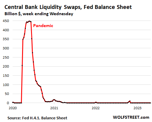 Bank Term Funding Program (BTFP): +$7 billion to $81 billion. Under this new program, rolled out on March 13, banks can borrow for up to one year, at a fixed rate, pegged to the one-year overnight index swap rate plus 10 basis points. Banks have to post collateral, but valued “at par.” For banks, the terms of BTFP are still punitive, though less punitive than the Discount Window.