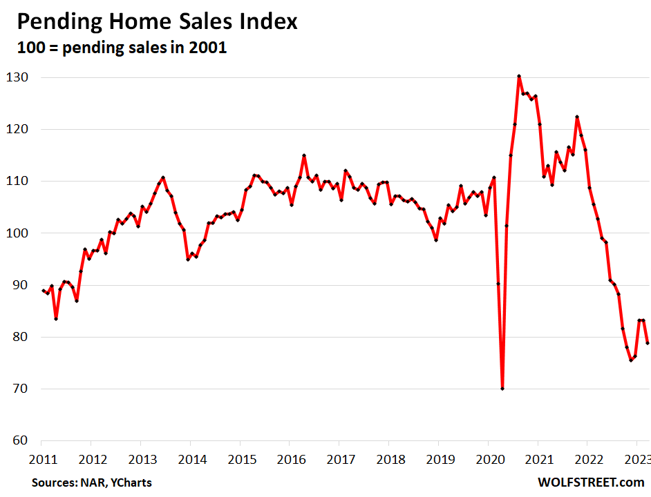 The National Association of Realtors didn’t say, but the banking crisis burst on the scene in early March. Silicon Valley Bank imploded on March 10, which shook up the entire startup ecosystem not only in Silicon Valley but across the US. The run on the bank had started weeks earlier, the startup scene was atwitter with it, so to speak; it just culminated in the final few days.