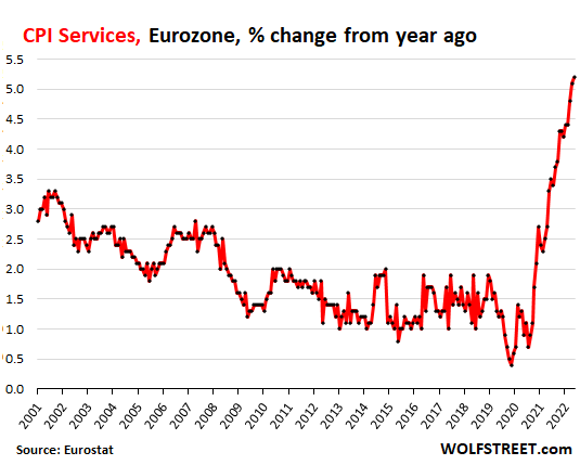 In the 20 countries that now use the euro, the annual rate of inflation in services rose to 5.2% in April, another record in the data going back to 1997, according to the preliminary data released by Eurostat today. Another nasty surprise, another sign that inflation has now shifted deeply into the economy in a fundamental way, despite sharp price drops of energy goods and some durable goods.