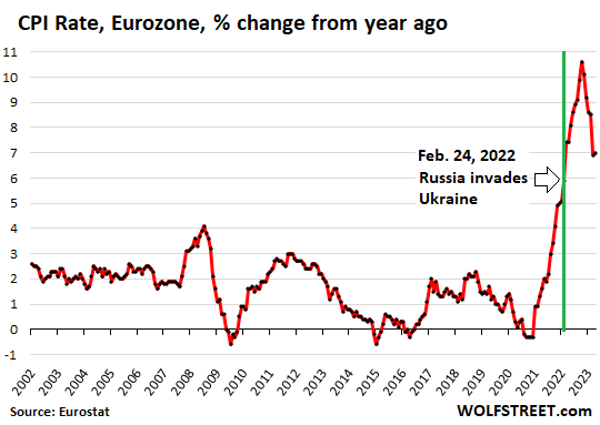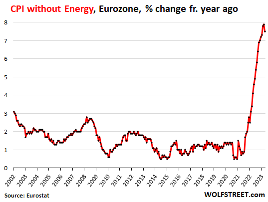 The “core” Consumer Price Index without energy – excludes energy products, such as gasoline, diesel, electricity, natural gas piped to the home, heating oil, etc. – at 7.5%, was a tad off its monstrous record in the prior month (7.9%), and was still nearly four times as high as the ECB’s target of 2%.