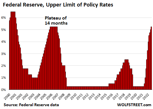 With today’s policy move, the upper end of the federal funds rate target is now where it last had been during the pause of 14 months, from June 2006 to September 2007. Plateaus after a series of rate hikes are the rule. In 2018, the plateau (at 2.5%) lasted seven months. In 2000, the plateau (at 6.5%) lasted eight months: