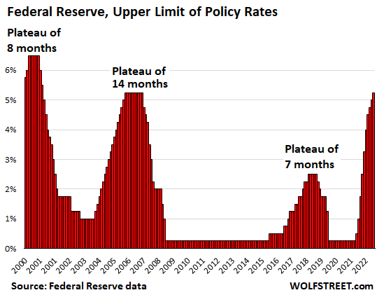 I find it more interesting that the rates dropping after the “plateau” took 17 months, 6 months, and 12 months before we see a return to baseline interest rates. I had to explode the graphs Wolf provided on my iPad so forgive my crude estimates.