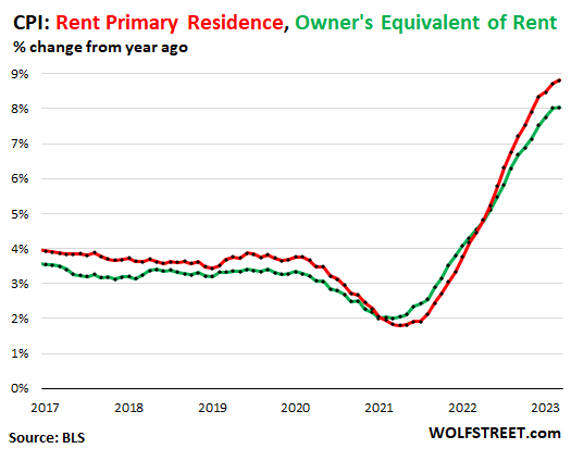 Both factors have shot up last year and this year. In March, OER was 8% and Rent hit 8.8%. The incremental increases slowed in March, and will likely slow further, and the year-over-year increases likely peaked, with annual rent inflation eventually dipping below that 8% level.