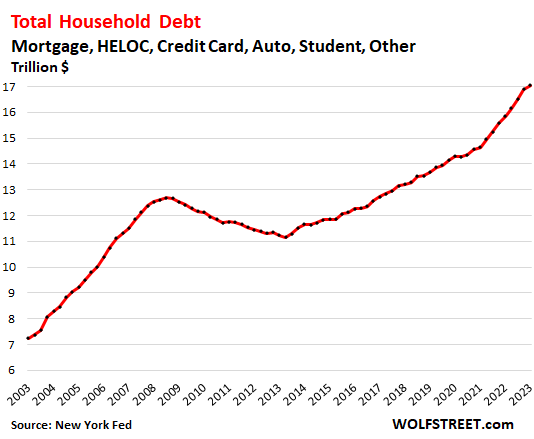 Total household debt includes mortgages, HELOCs, credit card balances, other revolving balances, auto loans, and student loans. Here is the OMG chart: