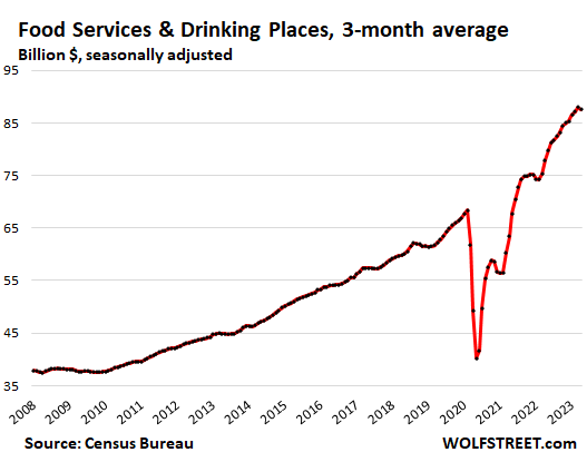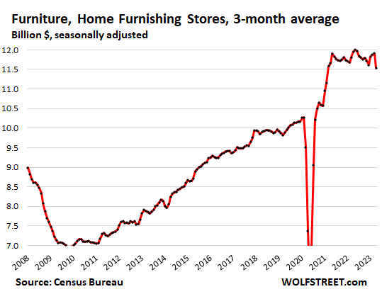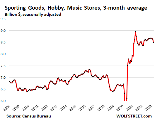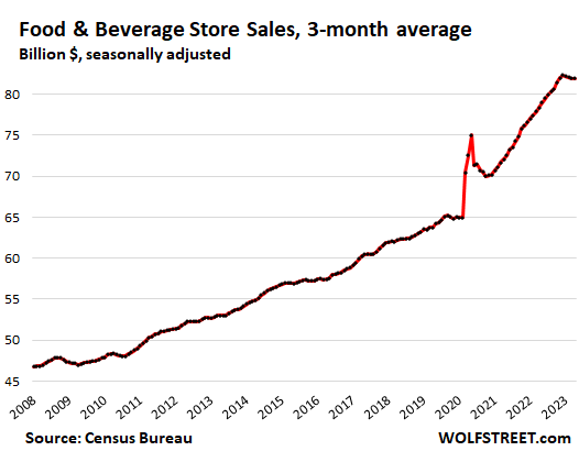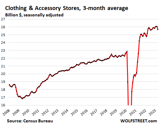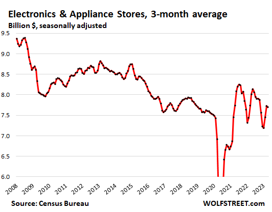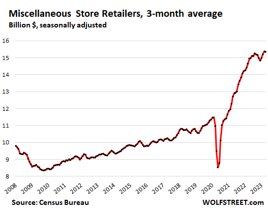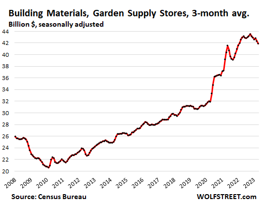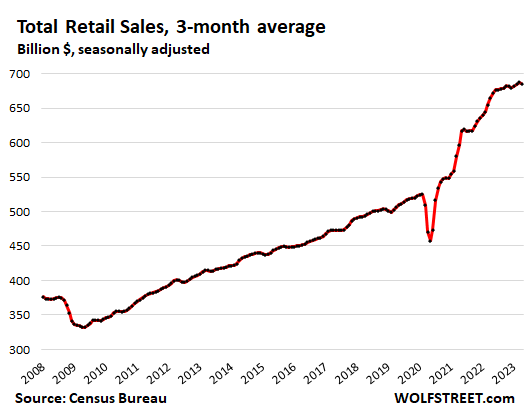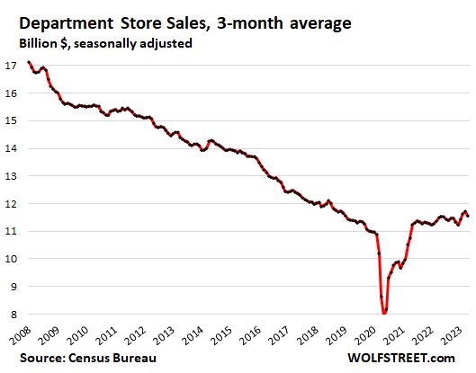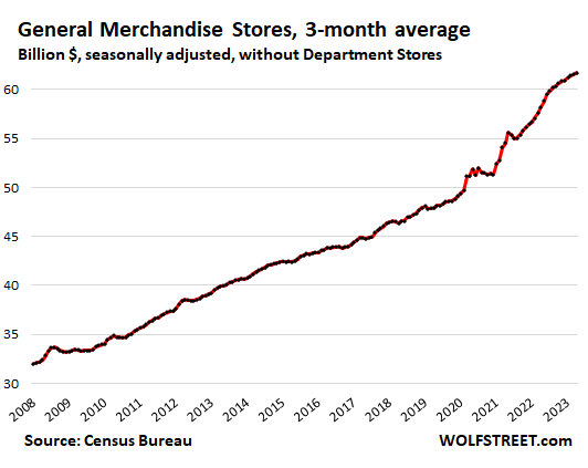 The trend shows normal-ish sales growth in recent months, after the huge stimulus-induced spike in 2020 and early 2021 that was then further boosted through mid-2022 by the raging price increases that have now abated, with inflation having largely shifted to services, which retailers don’t sell.