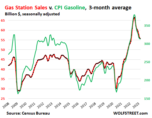 This chart shows the relationship between the CPI for gasoline (green, right axis) and sales in billions of dollars at gas stations, including other merchandise gas stations sell (red, left axis):
