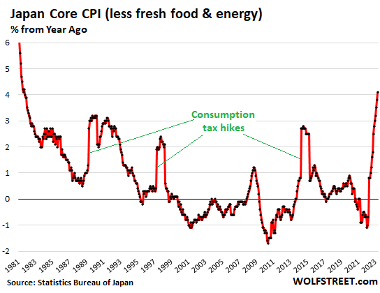 As a clear sign that underlying inflation has spread across the economy, Japan’s core Consumer Price Index – all items less fresh food and energy – spiked to a new 42-year high of 4.1% in April compared to a year ago, blasting past all the consumption tax hikes that had previously powered brief spikes in the CPI.