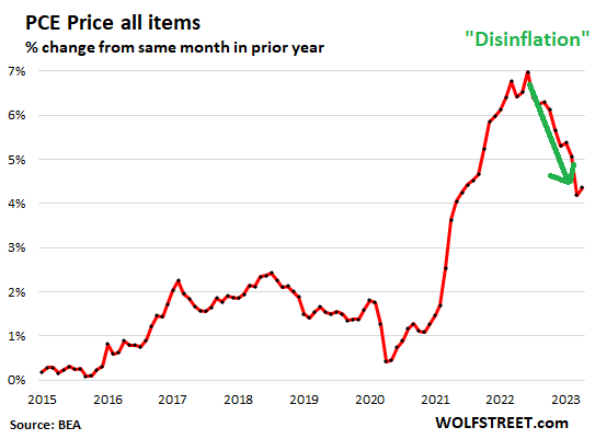 April was the first month that reflected consumer spending during the banking turmoil that started in mid-March, which was supposed to trigger tighter credit conditions – the “credit crunch”—that would slow down consumer spending, that’s what Fed officials from Powell on down have suggested.