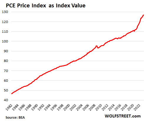 Inflation is just churning from one product category to another, falling here but popping up again over there like the arcade game of Whack A Mole. And so the core PCE price index continues to be stuck near the 5% level, when the Fed’s target is 2%. And the Fed uses this core PCE index as yardstick.