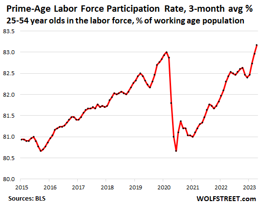 2) Next is the Prime Age participation rate, slightly > 2019 high. From 83.0% to 83.2%, an UT.