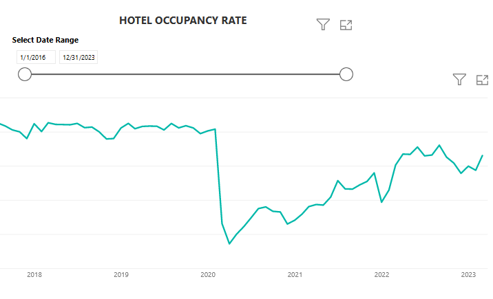 September 2023, occupancy was 76.6% compared to 87.4% in Sep 2019. So about 10 percentage points shy.
