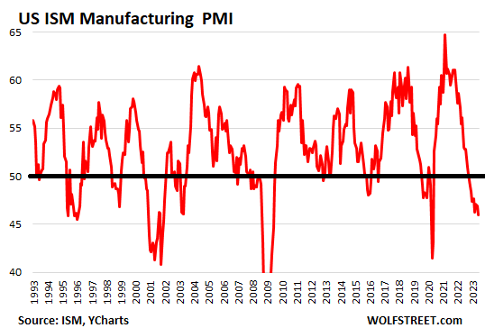 What is true is that IF there is a recession, the manufacturing PMI eventually drops to 45 or below. But it drops to around 45 just fine without a recession. So it’s not an indicator or predictor, but an occasional result.