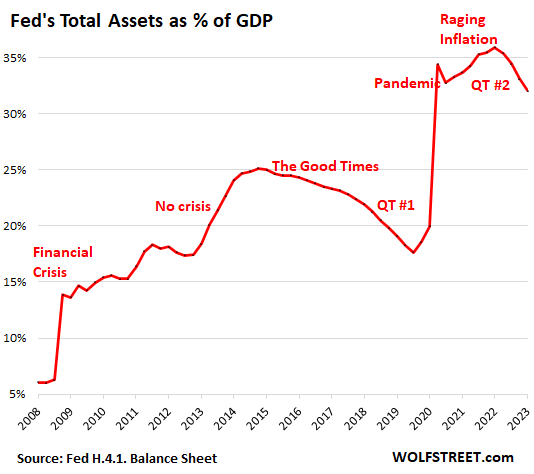 From crisis to crisis to raging inflation. Note QT #1 in 2018-2019, which removed $688 billion from the balance sheet. By the end of this month, 12 months into QT #2, the Fed will have unwound more of its assets than in the entire period of QT #1, despite the bank-panic bailout that at the peak had added $391 billion to the balance sheet.