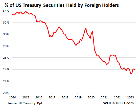 Foreign holders became less crucial. As the US debt has ballooned over the years, but foreign holdings have increased more slowly, the share of foreign holdings as a percent of the total federal debt has declined from the 33% range in 2014 to less than 24% in May. In other words, the US debt financing has become less dependent on foreign holders: