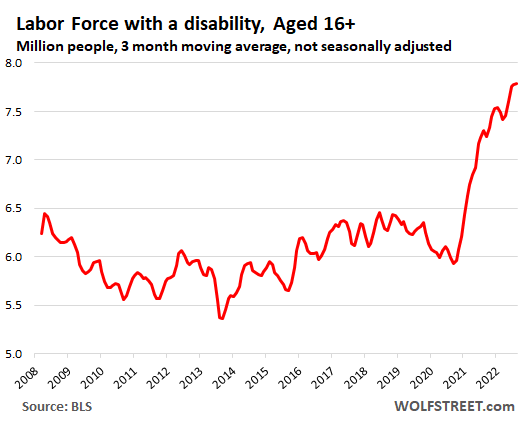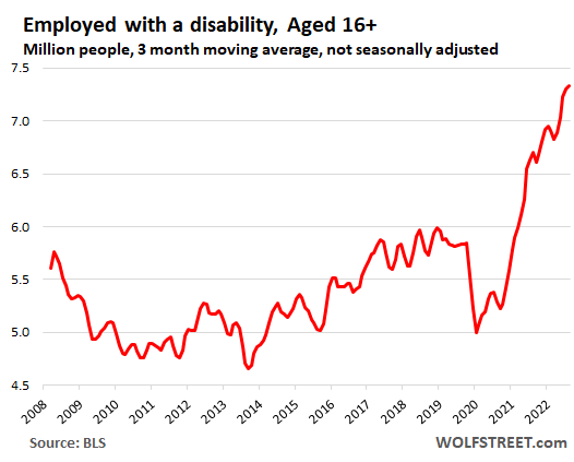 Bloggers look at this BLS data and think those are people claiming disability benefits. And then they publish all kinds of BS (lots of braindead bloggers out there). Nope, those are people “with a disability” in the workforce and working.