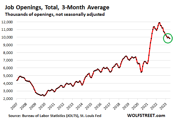 It translates into an annual rate of 5.5%, nearly double of where the Fed wants to see it to get inflation down to 2%. These “production and non-supervisory employees” include working supervisors and all employees in nonsupervisory roles, including engineers, designers, doctors and nurses, teachers, office workers, sales people, bartenders, technicians, drivers, retail workers, wait staff, construction workers, plumbers, etc.
