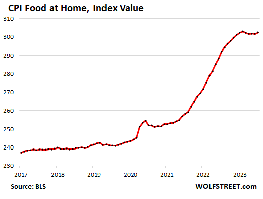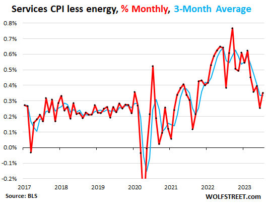- The “base effect” is starting to fade. The “base” for today’s year-over-year calculation is July 2022, which was the month the surge of the CPI started cooling sharply, driven by plunging energy prices. Those lower values in the second half of 2022 will be the base for the year-over-year calculations going forward, leading to bigger year-over-year increases.